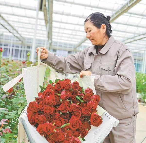 麗江現(xiàn)代花卉產(chǎn)業(yè)園工作人員打包玫瑰鮮切花。 記者 陳飛 胡妤雅 攝