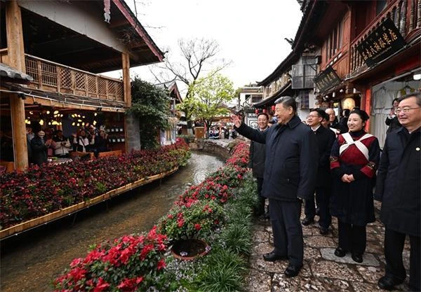 麗江古城有800多年歷史,被列入世界文化遺產(chǎn)名錄。一場春雪過后,麗江游人如織。習近平來到這里,詳細了解古城營建歷史、納西族民居特色和當?shù)匚幕z產(chǎn)保護利用、推動文旅融合發(fā)展等情況。居民和游客見到總書記十分興奮,爭相問好,有的還彈奏樂器、載歌載舞歡迎總書記。習近平頻頻與大家互動交流,了解商鋪經(jīng)營狀況和游客感受。他要求當?shù)靥幚砗帽Wo和發(fā)展的關(guān)系,讓這座美麗的古城煥發(fā)新的光彩。