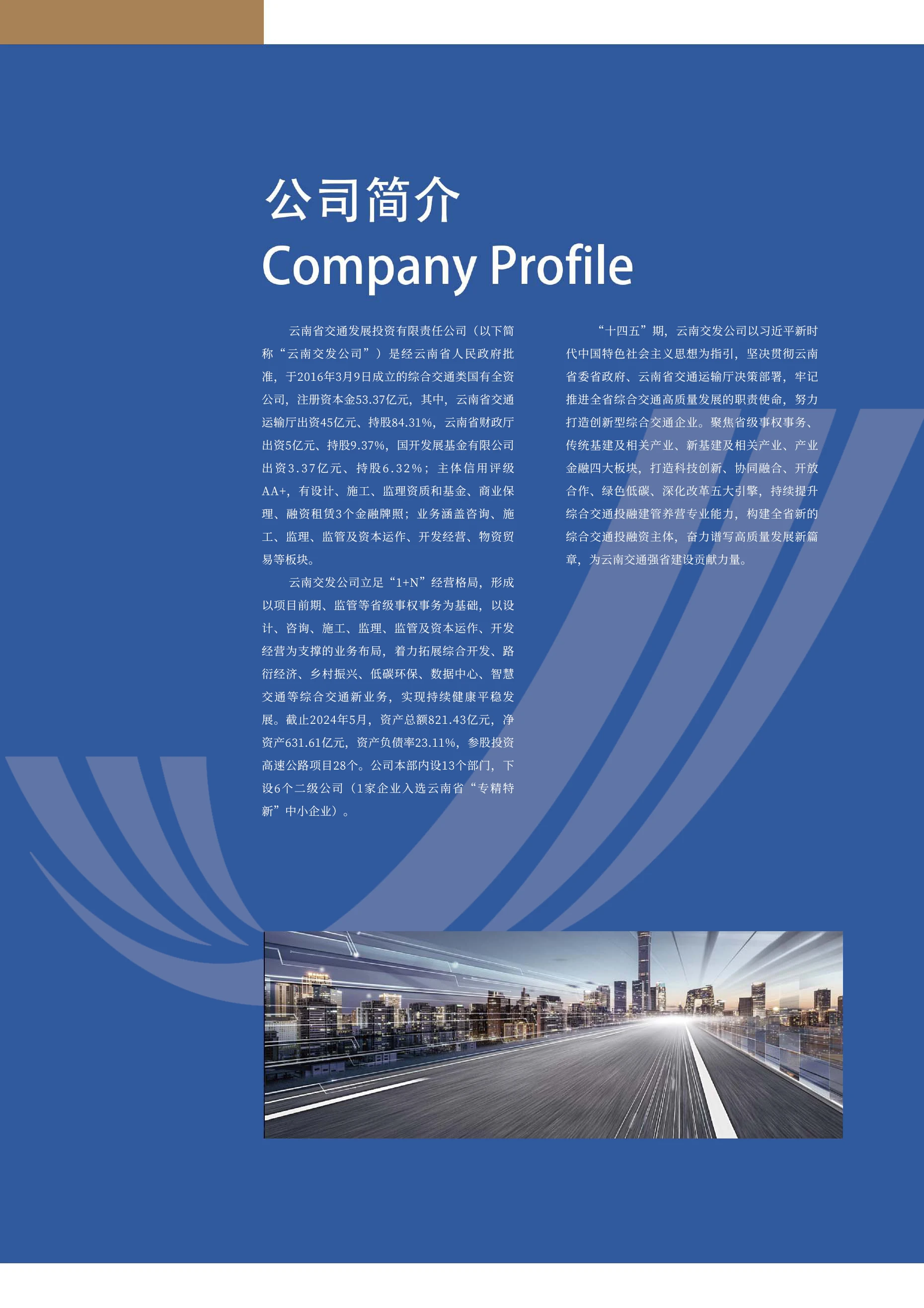 云南交發(fā)公路工程有限公司成立于2018年2月,前身為昆明誠展公路工程有限公司,2020年9月更名為云南交發(fā)公路工程有限公司,屬云南省交通發(fā)展投資有限責(zé)任公司全資子公司。公司注冊資本10億元,主營業(yè)務(wù)為公路工程施工、養(yǎng)護(hù)及電力工程施工,持有公路工程施工總承包一級、電力工程施工總承包三級以及路基路面、橋梁、隧道養(yǎng)護(hù)乙級、交通安全設(shè)施養(yǎng)護(hù)、施工勞務(wù)等多項資質(zhì)。