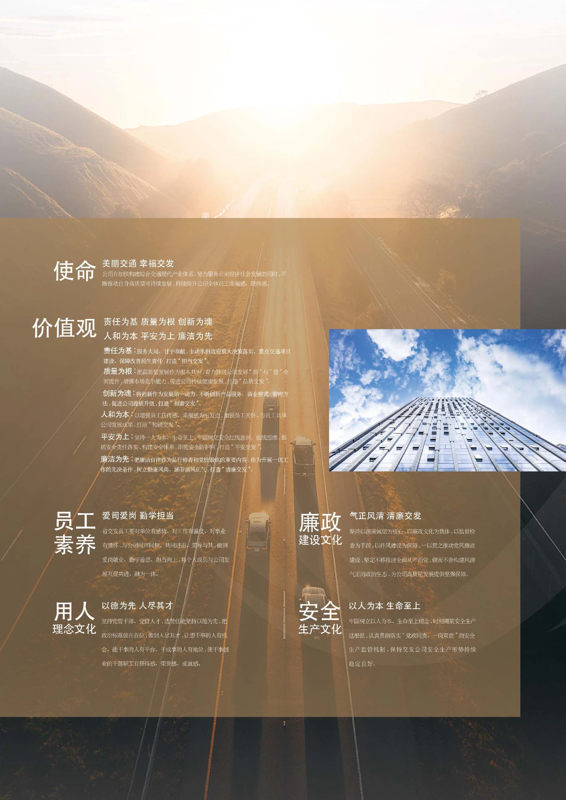 公司成立以來,緊緊圍繞省交發(fā)公司“1345”發(fā)展戰(zhàn)略及“1+N”經(jīng)營布局,秉承“持續(xù)創(chuàng)新、穩(wěn)健經(jīng)營、綠色發(fā)展、開放合作、共創(chuàng)共享”發(fā)展理念,弘揚“厚德篤行、至美致遠(yuǎn)”人文精神,堅定不移走市場化發(fā)展道路,矢志不渝做大規(guī)模、做優(yōu)產(chǎn)業(yè)、做強企業(yè)
