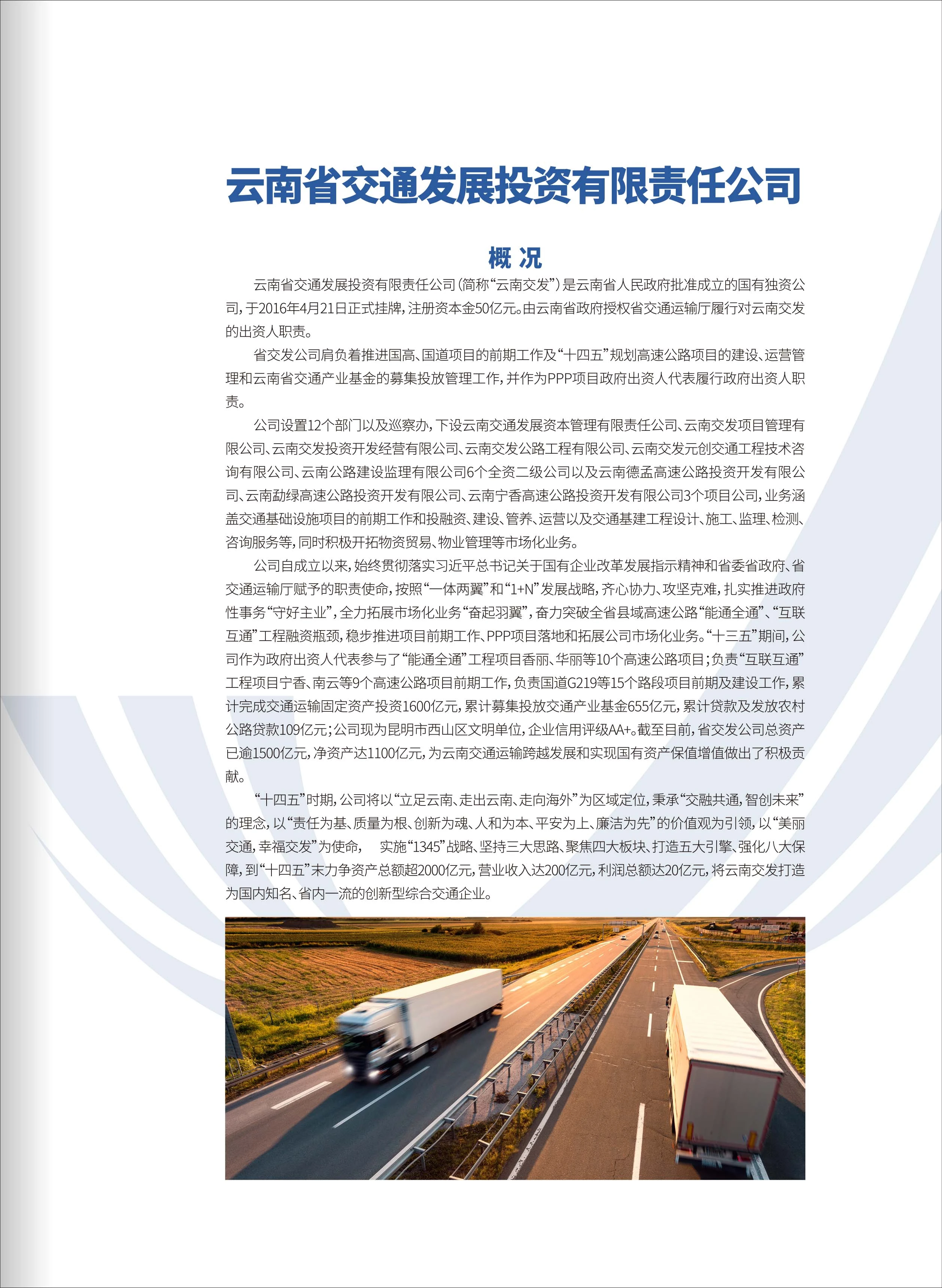 云南交發(fā)投資開發(fā)經(jīng)營有限公司于2018年1月30日成立,注冊資本金10億元,為云南省交通發(fā)展投資有限責(zé)任公司全資子公司,公司內(nèi)設(shè)6個部門,下設(shè)全資、控股、合資企業(yè)5個。